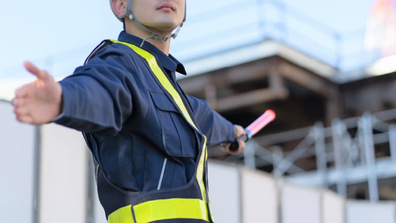 各種工事現場において、工事車両の出入りや一般車両・歩行者等の通行をスムーズに誘導し、円滑な工事の進行をサポートします。